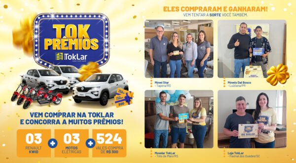 Ao longo da campanha também foram contemplados 524 clientes com vales-compra de R$ 300,00. Fique na torcida, a próxima Tok Prêmios vem aí. Aguarde!